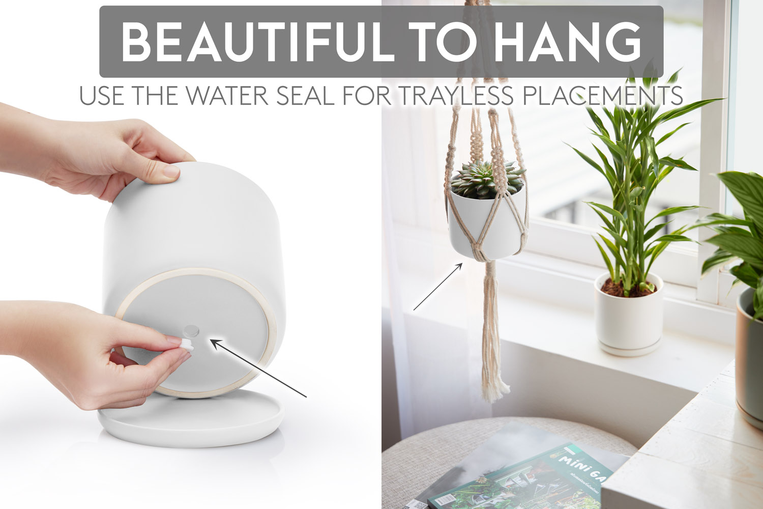 BEAUTIFUL TO HANG: Notice the base of each pot. They’re slightly curved so you can also hang them in macrame plant hangers. And if you love boho decor, you naturally love clean neutral hanging planters, right? And you can of course use the tray too! It’s YOUR home or desk decor – simplify it, your way. Available in 5 Matte Colors – black, white, grey, light green and light pink. Which do you love?